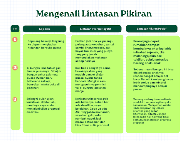 Sempat terlintas pikiran negatif wah enak ya jadi paksu, pulang-pulang langsung tiduran kayak gak ada beban. Padahal saya juga tahu kalau beliau setelah rehat sejenak akan mengajak kami (kalau saya sudah selesai masak), atau bareng anak-anak saja, ngabuburit sembari cari penganan berbuka. Demikian selanjutnya untuk dua kejadian lainnya sebagaimana yang dicantumkan dalam tabel.